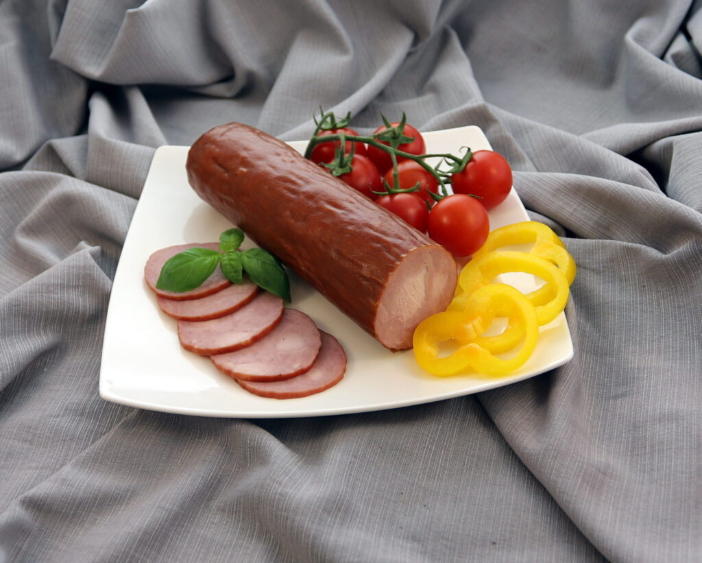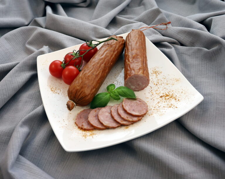 Kiełbasa wieprzowo-wołowa, drobno rozdrobniona, wędzona, parzona, suszona w osłonce niejadalnej